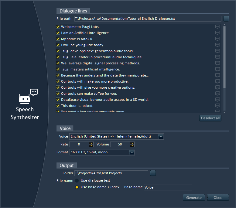 It’s not that uncommon in the game industry to generate placeholder dialogue lines with a speech synthesizer. So I decided to do the same with the test files and to write an application which would create all these files for us.
